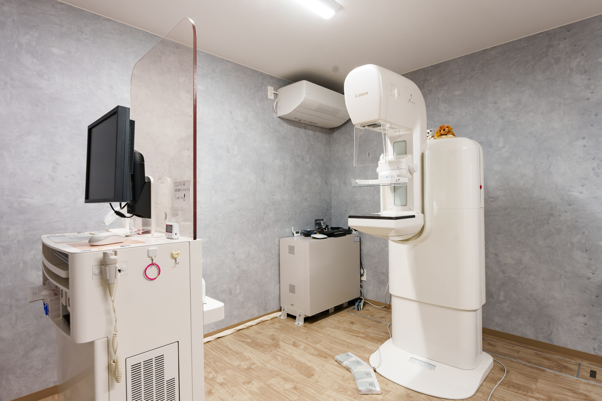 - 乳房を圧迫し、X線で内部を撮影します。微細な石灰化や小さなしこりの有無を調べることができます。